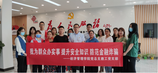 为推动“我为群众办实事”实践活动及提高服务社会能力,5月26日上午,304永利集团教工党支部在书记张召哲老师带领下联合沟赵办事处秋雅社区为社区居民开展“我为群众办实事,提升安全知识,防范金融诈骗”活动。