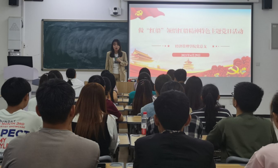 首先,聂老师向大家讲述了南湖红船的故事。1921年8月初中共一大的代表们登上了浙江嘉兴南湖湖心岛上的一条小船,在船上讨论通过了中国共产党的第一个纲领,庄严宣告中国共产党的诞生。这条游船也因而获得了一个永载中国革命史册的名字—红船。小小红船承载千钧,播下了中国革命的火种,开启了中国共产党的跨世纪航程。学习和弘扬红船精神乃我辈责任,红船精神并没有过时,伟大的时代需要伟大的精神,在全面进行社会主义现代化建设的今天,红船精神仍然是中国共产党引领中国人民实现现代化强国目标的蓬勃力量。