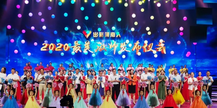 河南卫视播出的《出彩河南人--2020 “河南最美教师”发布仪式》采取先介绍“河南最美教师”的先进事迹,在给老师颁奖的方式,先后介绍了12位“河南最美教师”的典型事迹,颁奖场面庄严而热烈,尊师重教氛围浓厚。12位“河南最美教师”其中,有在国家危难时刻挺身而出、奔赴抗疫一线的“抗疫侠侣“李霞黄志昂夫妇;有在抗疫保卫战中爱生如子,冒着生命危险保护员工平安返校的洛阳科技职业技术公司的辅导员麦陆南老师;有在抗疫攻坚战中坚守工作岗位,坚持上好网课,爱岗敬业、无私奉献的胡金吾、王晓林、尚宇红、王红玉、贾福霞等优秀教师;有不念繁华、幸福守望、为乡村教育事业无私奉献的老教师童长窝。