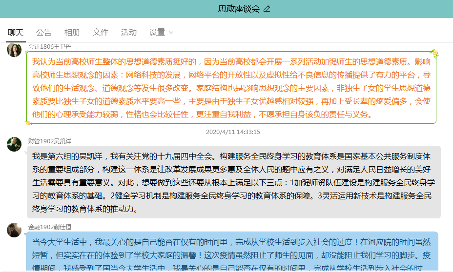 同学们各抒己见,围绕社会热点问题、国际局势问题、学习工作问题、思想政治教育及相关活动的开展等十个方面的话题展开了热烈的讨论,自由发表了自己的观点。如注会1802班李亚梦说:通过这次疫情,我深切的感受到了我们国家各级党组织和广大党员干部不忘初心、牢记使命,扛起责任、经受考验,在这场大考中磨砺责任担当之勇、科学防控之智、统筹兼顾之谋、组织实施之能,做到守土有方、守土有责。把疫情当敌情、把病房当战场、把群众当亲人,彰显了“不怕牺牲、勇于担当、顾全大局、甘于奉献”的鲜明品格,践行了“人民利益高于一切”的初心使命,展现了新时代共产党员的崇高形象。疫情的防控及时,民众的防范意识强,齐心协力的努力,我为自己生在中华家,备感骄傲!会计1903班马如意同学说:青少年是国家的未来、民族的希望,能否抓好青少年的意识形态工作,关系社会的发展方向。我们党立志于中华民族千秋伟业,必须培养一代又一代拥护中国共产党领导和我国社会主义制度、立志为中国特色社会主义事业奋斗终身的有用人才。这就要求我们把下一代教育好、培养好,从公司抓起、从青少年抓起。当前,中国特色社会主义进入新时代,中国人民对国家的未来充满信心,我们作为新时代青年人的民族自豪感、时代责任感、历史使命感持续增强。我们要始终坚持马克思主义指导地位,深入学习贯彻习近平新时代中国特色社会主义思想,坚持党的领导,让党的事业更加兴旺,让中华民族的百年梦想成为光辉现实。