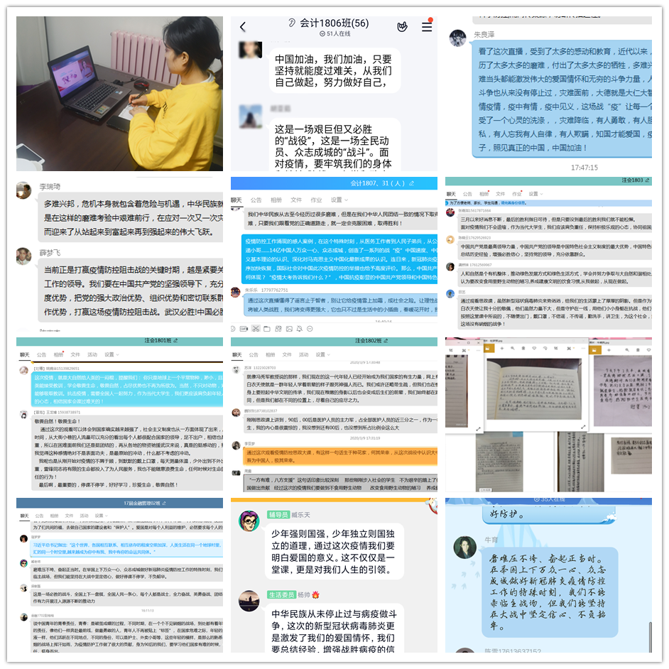疫情当前,我们不仅仅有医疗战线和国家政府的大力防控,更有高校教育工作者的全军出击,他们日以继夜,白天关注统计员工健康异动情况,晚上继续伏案挑灯备课,挂念着身处各地的员工们,他们是一群可敬之人,更是可爱之人。今日之中国,有着无数身怀大爱的人和职业,他们用满腔的爱国热情在无私的奉献,相信在我党的正确领导下,中国必胜!