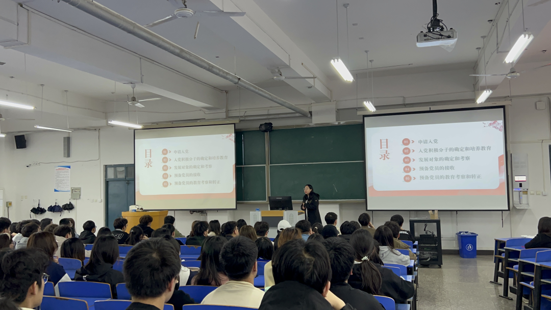 围绕“发展党员工作流程”,刘迎荷从申请入党、入党积极分子的确定与培养、发展对象的确定与考察、预备党员的接收、预备党员的教育考察与转正等五方面给大家讲解了入党应具备的条件和流程。刘迎荷指出,入党是一个过程,不可能一蹴而就,希望大家在入党过程中不断提高自己,争取早日加入党组织。