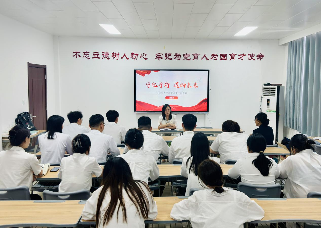为推动党纪学习教育走深走实,引导毕业生党员学纪、知纪、明纪、守纪,近日,校纪委书记陈雅莉在A505为304永利集团毕业生党员讲授“守纪于行 迈向未来”专题党课。副书记王盼红主持学习会。