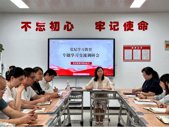 纪委书记陈雅莉做交流发言。陈书记对经管公司党总支党纪学习教育的开展情况给予了充分肯定,并结合校企合作、科研工作、违规兼职取酬、项目管理等方面向大家做出廉洁教育提醒。就如何进一步深化学习、以学促干,陈雅莉指出,要充分认识到党纪学习教育的重要性,要做到原原本本、实实在在的学习,不断增强对党的思想的政治认同、思想认同、理论认同和情感认同;要做到遵规守纪,把学习贯彻《条例》作为重要政治任务,自警自律、防微杜渐;要推动党纪学习教育走深走实,以良好的纪律建设确保坚守社会主义办学方向,落实党委工作部署和立德树人根本任务。