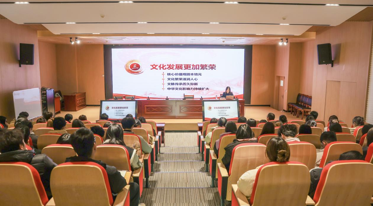陈雅莉以“七十五载迎盛世 砥砺前行续华章”为主题,运用翔实的数据和耳熟能详的案例从“经济持续健康发展”“民主之路越走越宽”“文化发展更加繁荣”“人民生活极大改善”“美丽中国焕发新颜”五个方面带领同学们系统回顾了新中国成立75年来所取得的辉煌成就。陈雅莉强调,中国共产党领导全国各族人民同心同德、艰苦奋斗、自信自强、守正创新,创造了新时代中国特色社会主义的伟大成就。中华民族迎来了从站起来、富起来到强起来的伟大飞跃,实现中华民族伟大复兴进入了不可逆转的历史进程,这是我们党团结带领人民进行伟大斗争的结果。