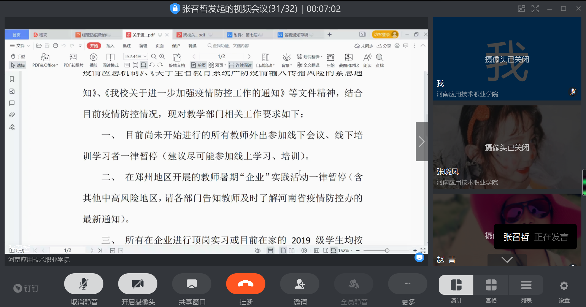 当前,疫情呈现快速蔓延趋势, 防控形势异常复杂严峻。结合《全省教育系统新冠肺炎疫情防控工作视频会议》安排,根据《河南教育系统立即启动疫情应急机制》、《关于全省教育系统严防疫情输入传播风险的紧急通知》、《公司关于进一步加强疫情防控工作的通知》等文件精神,结合目前疫情防控情况,304永利集团于8月1日晚8点在钉钉平台召开疫情防控专题工作视频会议,对教师企业实践、顶岗员工管理、教学等相关工作提出具体要求,全体专兼职教师参加了此次视频会议。