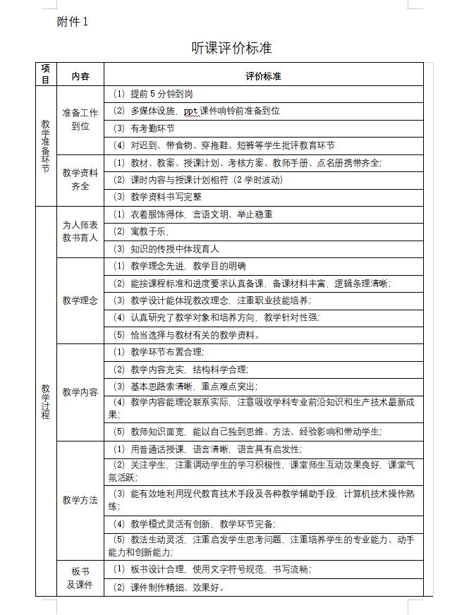 1.经理、副高级及以上职称教师、教学办主任、教研室主任、每学期按组别听课,填写附件1听课评价标准;