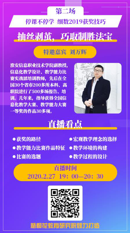 第二期是由淮安信息职业技术公司刘万辉教授主讲的“停课不停学,细数2019教学能力比赛获奖技巧”。刘万辉教授以2019年教师教学能力比赛作品为切入点,细致深刻地剖析了教学能力比赛需要准备的材料、比赛的突破方式、不同作品类型的塑造模型、教学设计的要素与方法、教学过程的组织实施策略以及比赛网评提交教学材料的准备技巧,尤其对课堂思政融入信息化教学设计中的有效应用进行了认真分析。