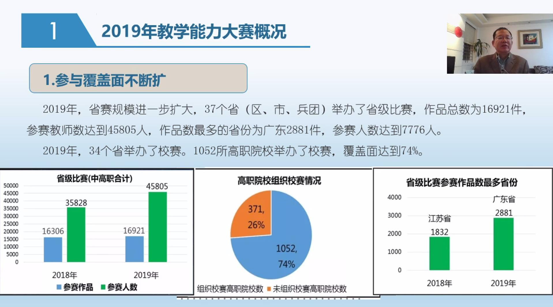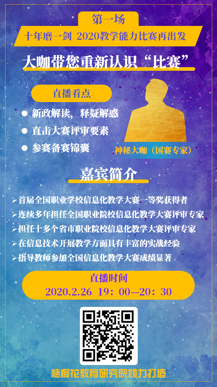 直播共两期,第一期是由厦门市教育科学研究院陈振源教授主讲的“十年磨一剑,2020教学能力比赛再出发”。陈振源教授多年来潜心钻研职业教育教材及课程标准制定,连续多年指导全国信息化教学大赛工作,在现代教育思想和教学理念的结合方面有着独到的见解。陈振源教授围绕2019年教学能力大赛概况、以赛促教规范、职业教育发展新趋势、教学能力比赛新发展、课堂教学新变化与信息化技术新要求等多个主题,结合参赛作品案例,进行了全面深入的政策解读。并对备战2020年教学能力大赛提出了相关建议:参赛教师要学习赛程,熟悉相关的文件,参赛作品要回归教学,回归课堂。他还指出举办大赛是为了促进职业公司产品更加规范,信息化大赛将从重选手的现场表演转向重作品的内涵,从重作品的技术包装转向重选手的综合素质,使职业教育正规向好发展。