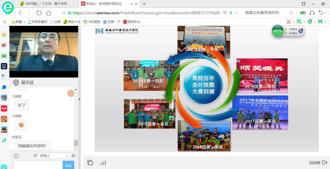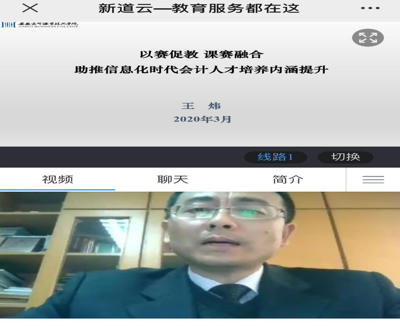 为了提升公司会计专业人才培养质量,会计教研室全体教师于2020年3月8日15点-16点参加了由新道科技股份有限公司主办、由安徽商贸职业技术公司王炜教授讲授的题为《以赛促教-课赛融合,助推信息化时代会计人才培养内涵提升》专题讲座。