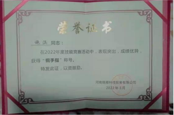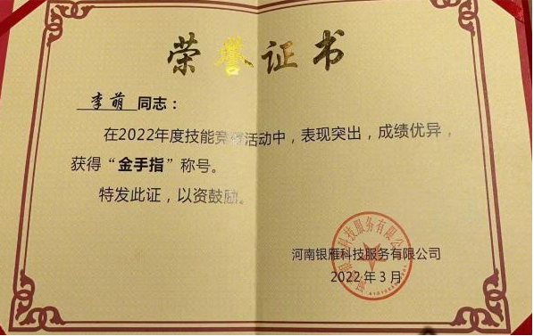 近日,304永利集团李萌、施涵在2022年度技能业务比武中,分别荣获河南银雁科技服务公司“金手指”“铜手指”荣誉称号。