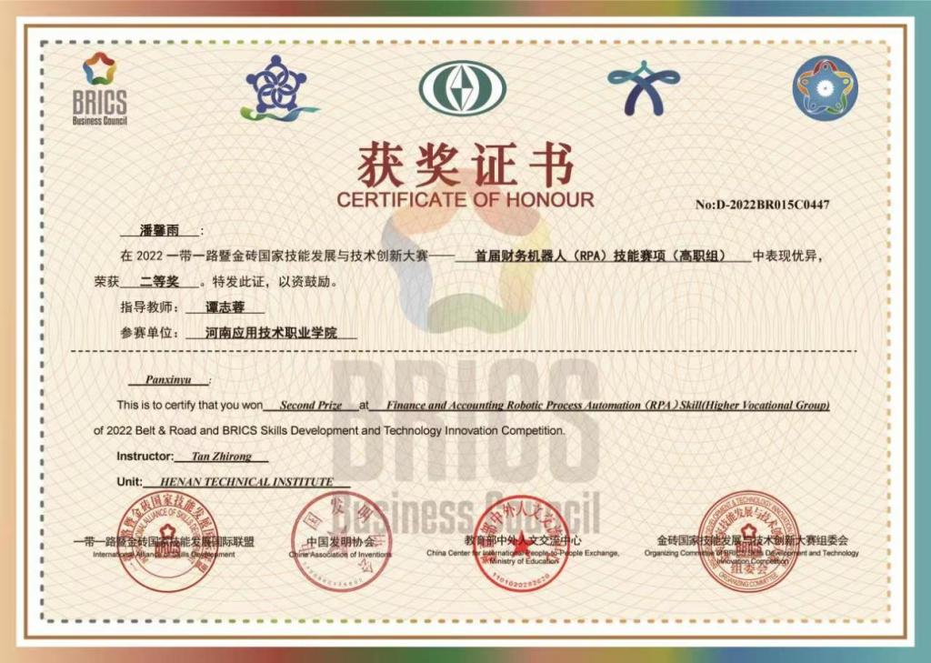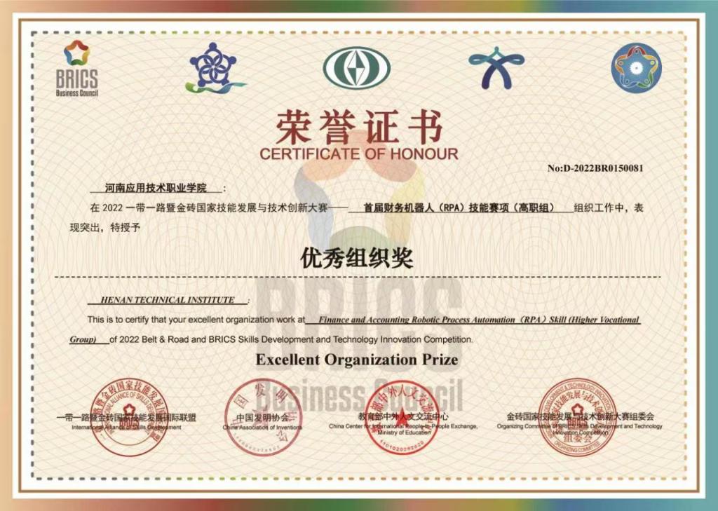 近日,“一带一路”暨金砖国家技能发展国际联盟、教育部中外人文交流中心等单位颁发了该赛项获奖奖励证书,公司经管公司员工潘馨雨、苏丹丹等组成的两个代表队分别荣获高职组国赛二、三等奖好成绩,同时公司被授予“优秀组织奖”。
