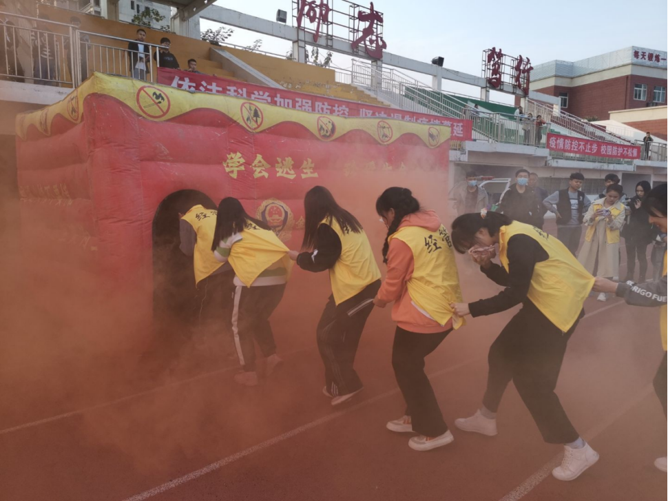 演练前,教员详细讲解进入逃生屋的注意事项,对消防安全隐患排查整治、应急处置等关键环节进行了着重强调,要求师生员工认真学习消防安全知识,掌握逃生疏散技能。随后六个人组成一队,待烟雾弹燃放后,演练总指挥下达“开始疏散”指令,在急促的哨声中,参与演练的员工在浓烟中用湿手帕捂住口鼻,在疏散工作人员的指导下,有条不紊地逐一亲自演练指定的项目,“身临其境”的掌握相关动作要领,结束后有序撤离到了预定的安全地带。最后,李警官以“提高消防意识,维护校园安全,从自身做起”为主要内容,举例近几年的校园火灾案例,向全校员工发出安全防范倡议,并得到了在场同学的积极响应。