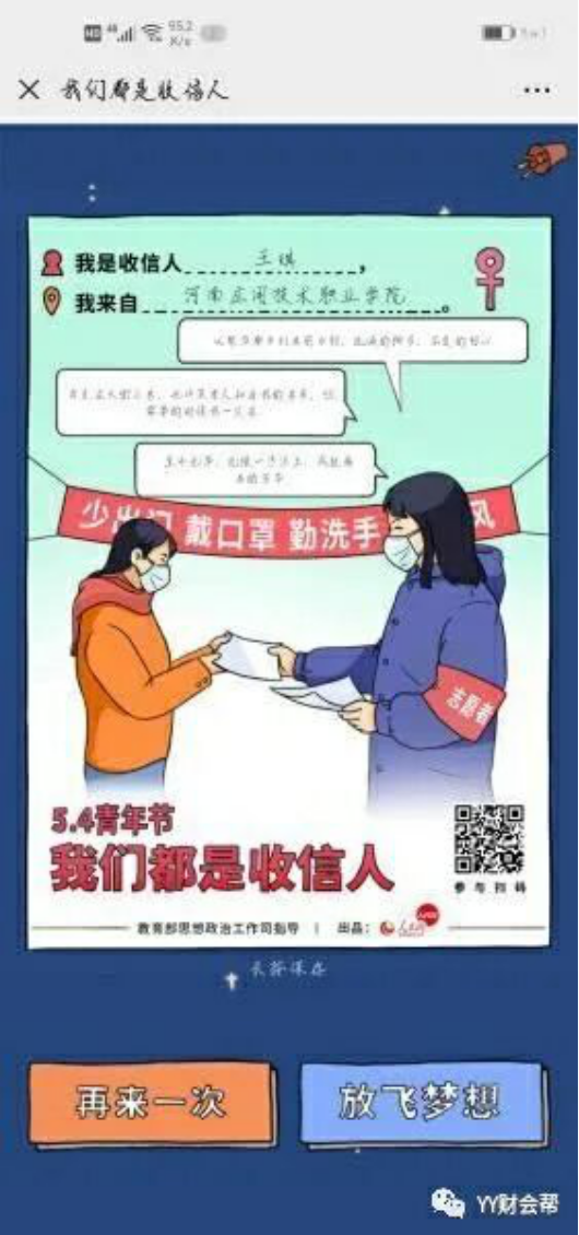 五四运动101周年,青春中国风华正茂。战疫中的年轻力量,生动诠释并为五四精神打上独特的时代印记。3月15日,习近平总书记给北京大学援鄂医疗队全体“90后”党员回信,向他们和奋斗在疫情防控各条战线上的广大青年致以诚挚的问候。总书记在回信中希望,青年一代要“有理想、有本领、有担当”,要“在为人民服务中茁壮成长、在艰苦奋斗中砥砺意志品质、在实践中增长工作本领”。教育部思政司指导、人民网出品H5交互策划《我们都是收信人》,刻画还原战“疫”情景,向学子发出青春三问,动员学子以执着的信念、过硬的本领,成长为新时代的有为青年。5月4日青年节当日,304永利集团全体师生利用微信、微博,参与评论互动,助力主题活动,留下了自己的青春宣言。