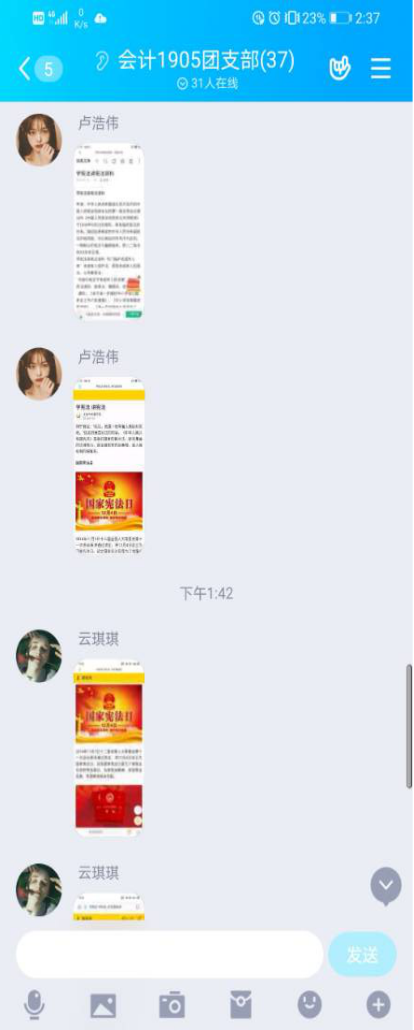 一、学习宪法知识,提高宪法意识。各团支部前期积极筹备团课材料,以不同的形式开展此次团课,其中,会计1903团支部由团支书马如意为大家简单介绍了:“中华人民共和国宪法是中华人民共和国全国人民代表大会制定和颁布的国家根本大法,规定国家的根本制度和根本任务,公民的基本权利和义务,国家机构的组织原则和职权。宪法具有最高的法律效力,一切法律、法规都必须依据宪法,都不得同宪法相抵触。”然后播放了一个视频给大家深入介绍了宪法的内容以及作用。期间,同学们表现积极,认真观看了视频,反响良好。注会1902班团支部组织团体员工积极学习新中国宪法的发展历程、宪法的意义、宪法的作用等有关宪法的知识。“宪法是我国的根本法,是治国安邦的总章程”。宪法在根本上和宏观上确定着控制国家权力的基本原则、基本制度和基本方法。而宪法确定这些基本原则、基本制度和基本方法的最高价值是维护人的尊严,可以说,宪法所确定的基本原则、基本制度和基本方法都是围绕着如何更好地维护人的尊严而展开的。一切国家权力均来源于宪法并受制于宪法,宪法不仅控制着整个国家权力,而且国家权力之组成部分的立法权、行政权和司法权的运行和展开,守法是青年员工健康成长的需要,不仅要学习宪法知识,提高宪法意识。