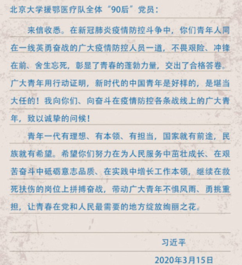 2. 让青春在党和人民最需要的地方绽放——习近平总书记给北京大学援鄂医疗队全体“90”后党员回信