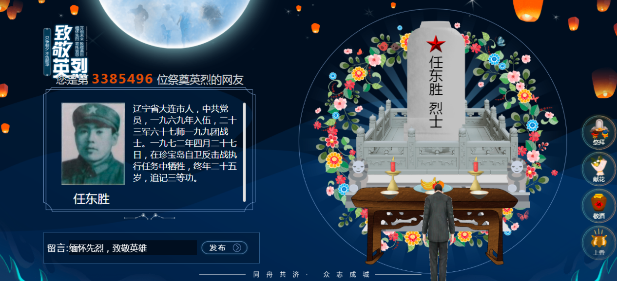 清明祭扫是中华民族的传统习俗,也是革命传统教育、爱国主义教育和感恩教育的重要方面。2020年是中国人民抗日战争暨世界反法西斯战争胜利75周年,中国人民志愿军抗美援朝入朝作战70周年。退役军人事务部以“致敬·2020清明祭英烈”为主题,以缅怀先烈、弘扬英烈精神为重点,开展网上祭扫,致敬英雄烈士。304永利集团团总支组织全公司34个团支部共1450人通过退役军人事务部主办的中华英烈网设立的祭扫专栏进入,利用集中统一的网上祭扫平台开展祭扫。活动以特殊的祭扫形式,向那些为新中国成立和人民幸福生活而英勇献身的烈士们、向在此次疫情中奋勇“逆行”的英雄们表达一份敬意,寄托一份思念,进一步传承和弘扬英烈精神,营造致敬英烈、缅怀英烈的浓厚氛围。