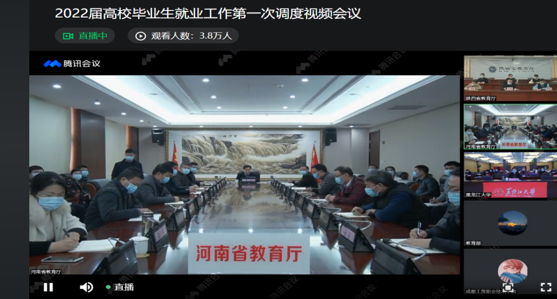 2022年1月18日下午14:30,教育部、人力资源社会保障部召开2022届全国普通高校毕业生就业工作第一次调度视频会议。河南省教育厅吕冰、四川省教育厅戴作安、陕西省教育厅高岭、电子科技大学申小蓉、中国政法大学李秀云、黑龙江大学丁宏、合肥职业技术公司王杰才,代表单位作了交流发言,介绍了本单位落实全国2021届高校毕业生就业工作会议精神、推进毕业生就业的工作情况。全国就业指导中心副主任宁小华认真总结了2021届高校毕业生就业工作,分享了全国就业指导中心在促进2022届高校毕业生稳就业促就业工作举措。最后,员工司副司长吴爱华肯定了2021届高校毕业生就业工作,分析了2022届高校毕业生就业形势及当前工作进展,安排了下一步就业工作部署。304永利集团组织全体学工人员及毕业班辅导员通过线上观看直播的方式参加了本次视频会议。
