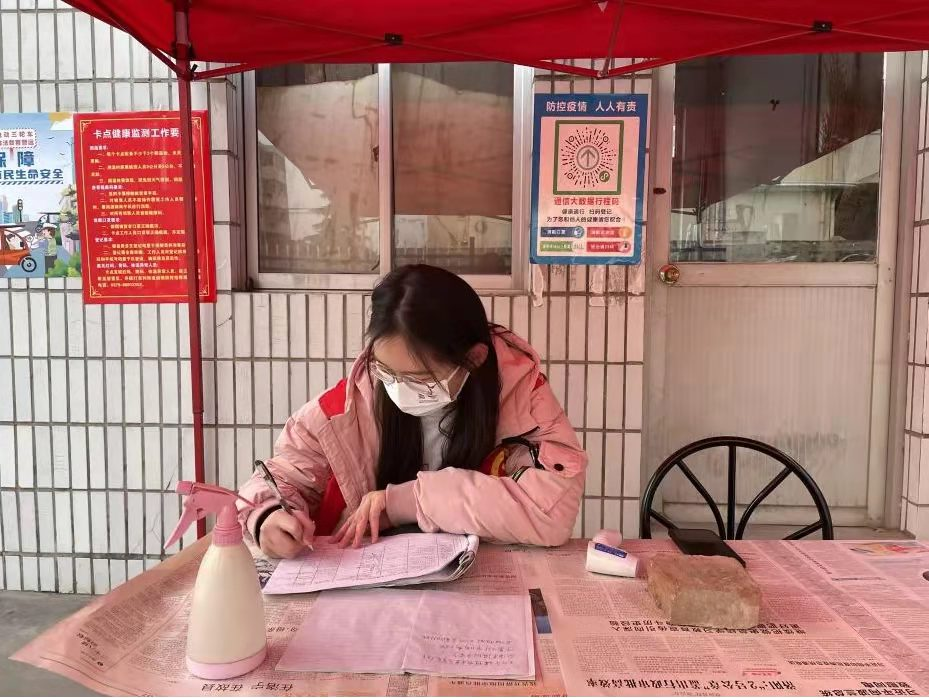 在社区的统一安排下,该同学被分配到社区疫情防控的卡点岗位上,主要负责对来往人员的体温检测、健康码行程码查验等。工作中,她认真负责,不敢有一丝放松,希望通过自己的努力,为家乡的疫情防控工作贡献自己的力量。