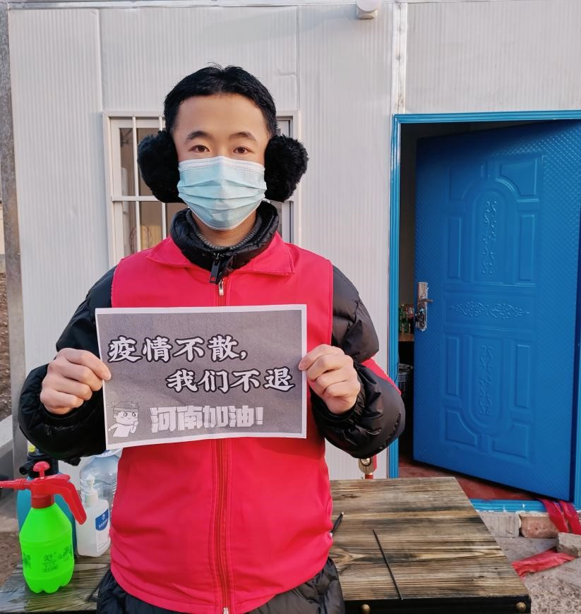安阳市疫情形势紧张,家乡紧邻安阳,疫情防控也不容忽视。作为志愿者,他始终把好进入家乡的第一关,他在志愿工作中积极热心,坚守岗位,尽职尽责,用自己的实际行动感染了身边人,努力为家乡的疫情防控贡献自己的力量。