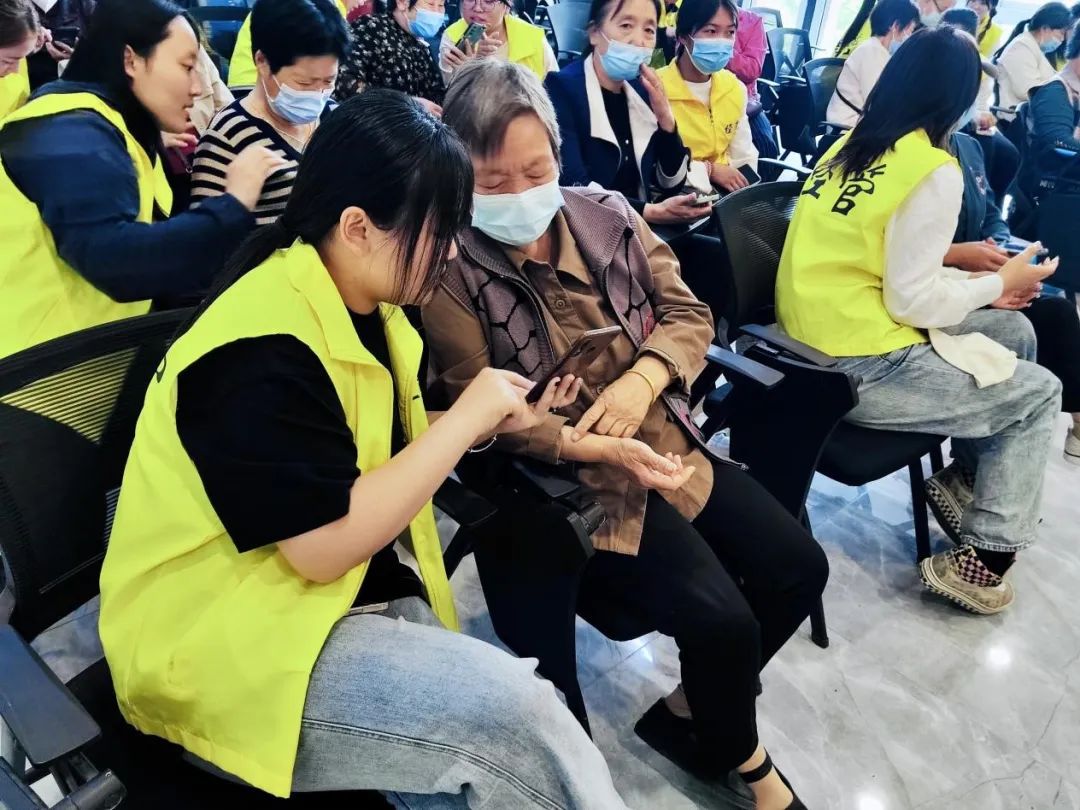 活动中,志愿者代表骈雪颖上台进行“智能手机使用指南”专题培训,从字体大小调整、添加微信好友、语音编辑发送、手机支付收款等常用场景切入,给老年人详细讲解简洁高效使用智能手机的技巧方法。老人们边听边操作智能手机,身旁的志愿者作为助教进行“手把手”指导。