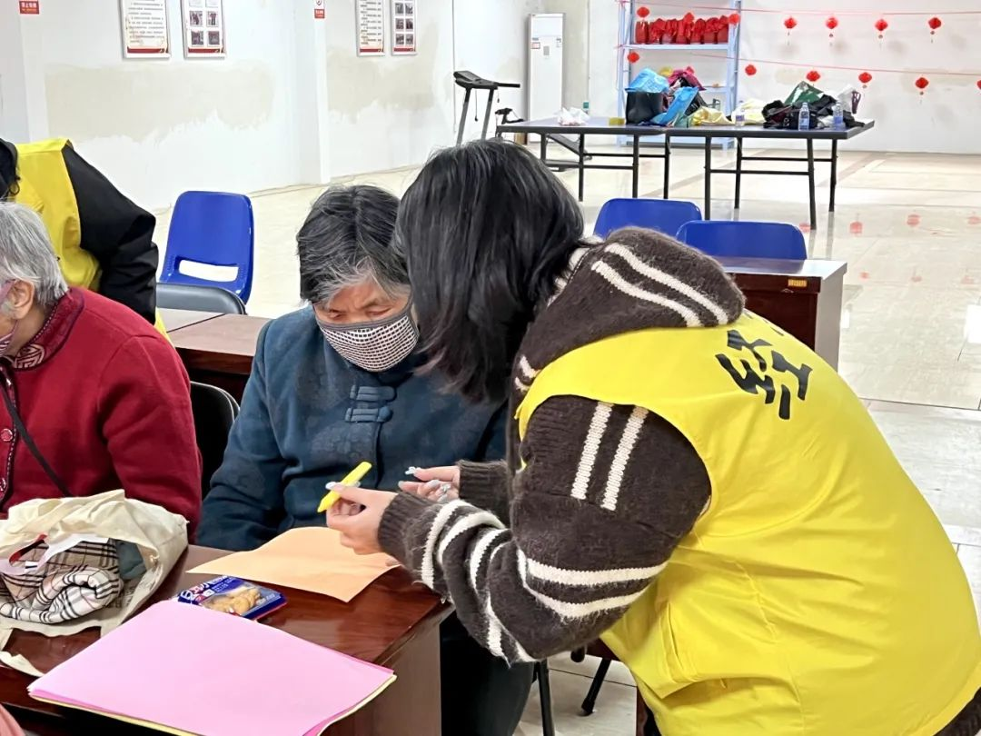 伴随着和煦春风,同学们早早抵达现场,协助工作人员一起布置会场,如摆放桌椅、披挂横幅、分发小零食等。一切准备就绪之后,老年朋友陆续来到活动现场。在他们面前,除了美味零食,还有“黄手环”宣传册、雷锋故事、雷锋语录、识字辩色答题卡等活动资料。