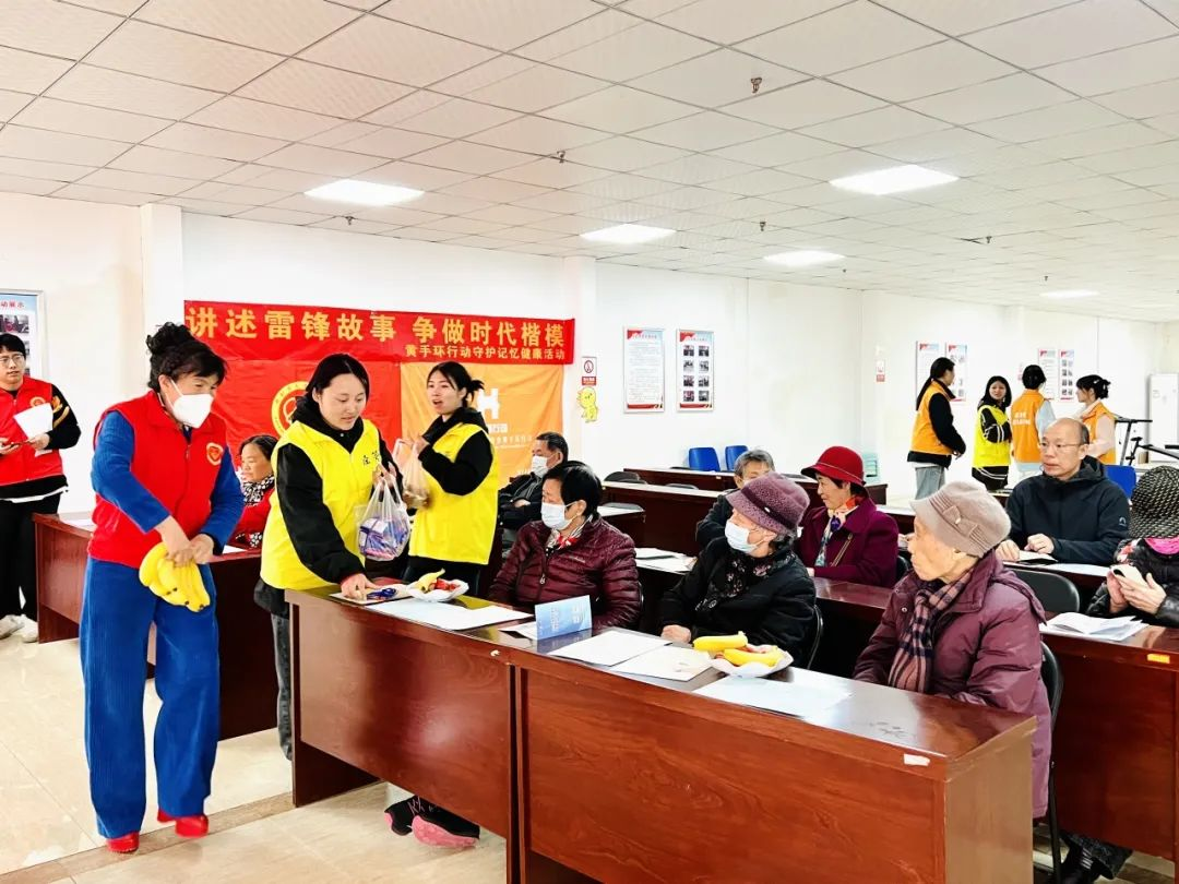 在周照昀同学的主持下,活动正式开始。首先,志愿者们给老年朋友们普及了阿尔茨海默病知识及黄手环行动项目的宗旨。其次,志愿者们手把手教老年朋友学唱《学习雷锋好榜样》,同时进行手指舞教学。在边唱边舞中,增进手眼脑协调性,改善大脑功能。接着,进行“填字改字”“看字读颜色”游戏。在游戏过程中,老年朋友们积极思考、互动频繁,现场气氛十分活跃。此外,老年朋友们还分享了“我所知道的雷锋故事”。在故事中,志愿者们再次感受穿越时空的伟大信念与力量。