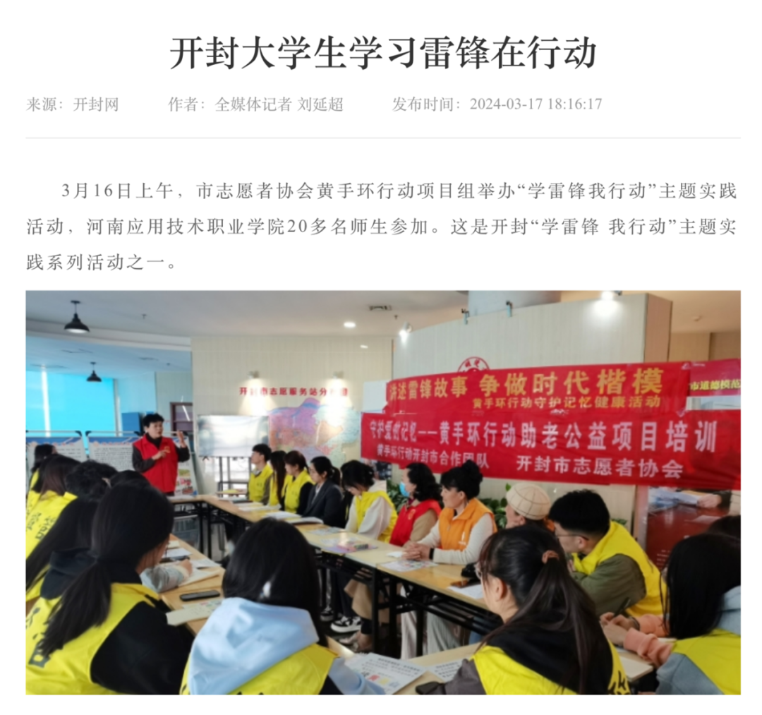 据悉,为更好服务本次志愿服务活动,志愿者们放弃休息时间,在双休日期间前往开封志愿者活动中心接受“守护爱的记忆——黄手环行动助老公益项目”培训。在本次志愿服务活动中,同学们认真负责、吃苦能干,获得参与者及志愿服务中心一致好评并得到了宣传与肯定。
