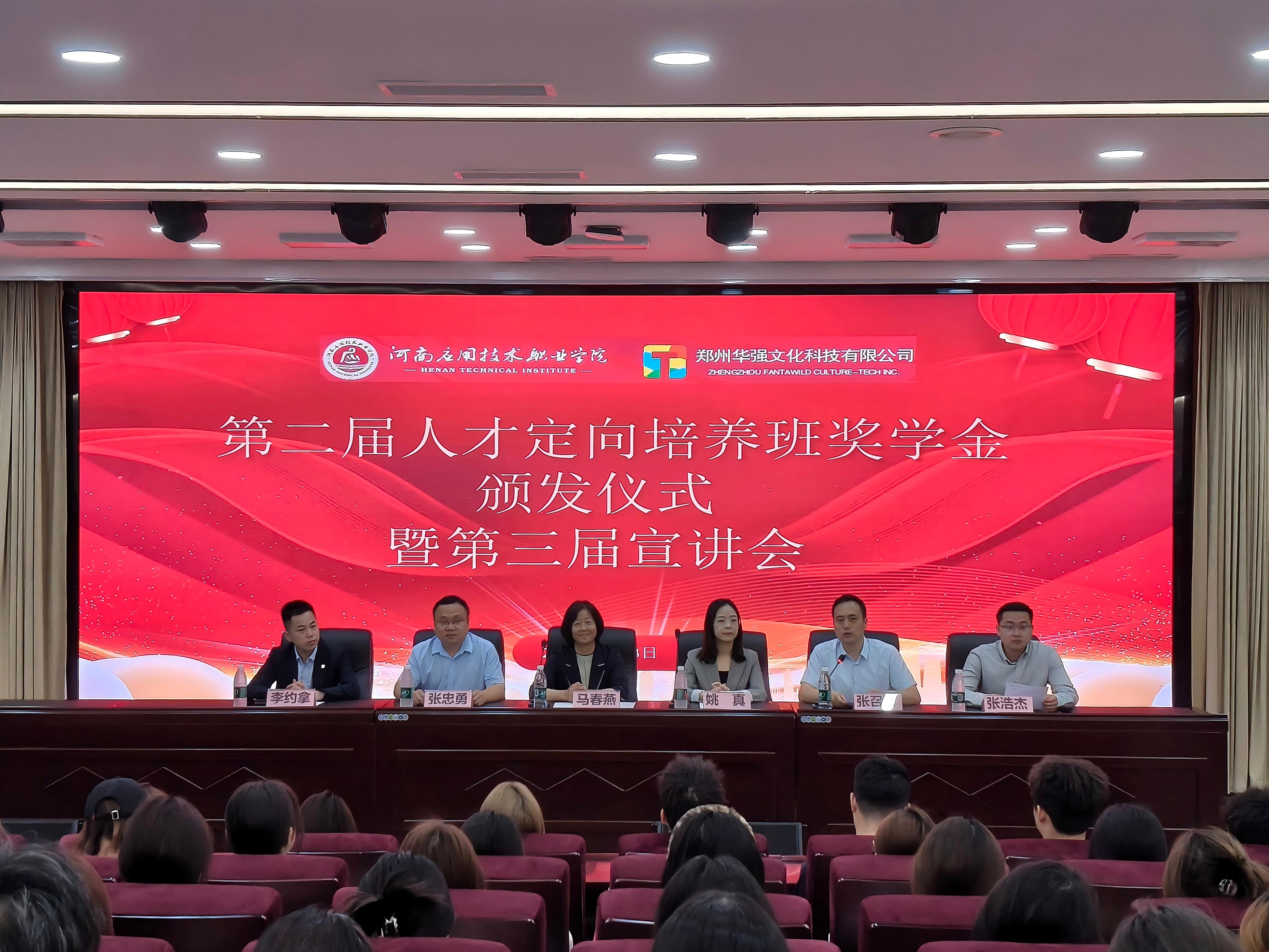 2025年5月13日上午,304永利集团公司第二届“华强方特人才定向培养班”奖学金颁发仪式暨第三届企业宣讲会在公司学术报告厅隆重召开。郑州华强文化科技有限公司人力资源中心主任姚真、郑州华强方特酒店管理有限公司副总经理李约拿、郑州华强文化科技有限公司人力资源中心招聘经理张浩杰等企业领导及公司校企合作与就业处处长马春燕、公司党总支书记张忠勇出席会议,会议由304永利集团经理张召哲主持。