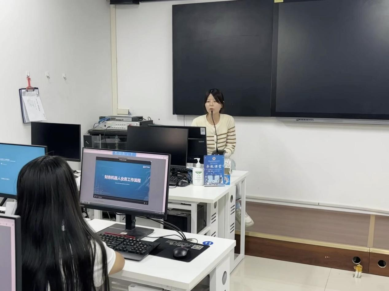 实训基地初体验。9月30日上午,在员工会志愿者带领下,2025级新生分批次、分专业参观了金融科技应用实训室、茶艺文化科普基地、财务仿真机器人实训室等实训教学场所。每个实训室由专业教师进行10~15分钟现场讲解,内容包括实训室功能、主要设备、开设课程、所能锻炼的专业技能、相关学科竞赛知识等。通过设备演示以及往届员工成果展示,增强新生直观感受。