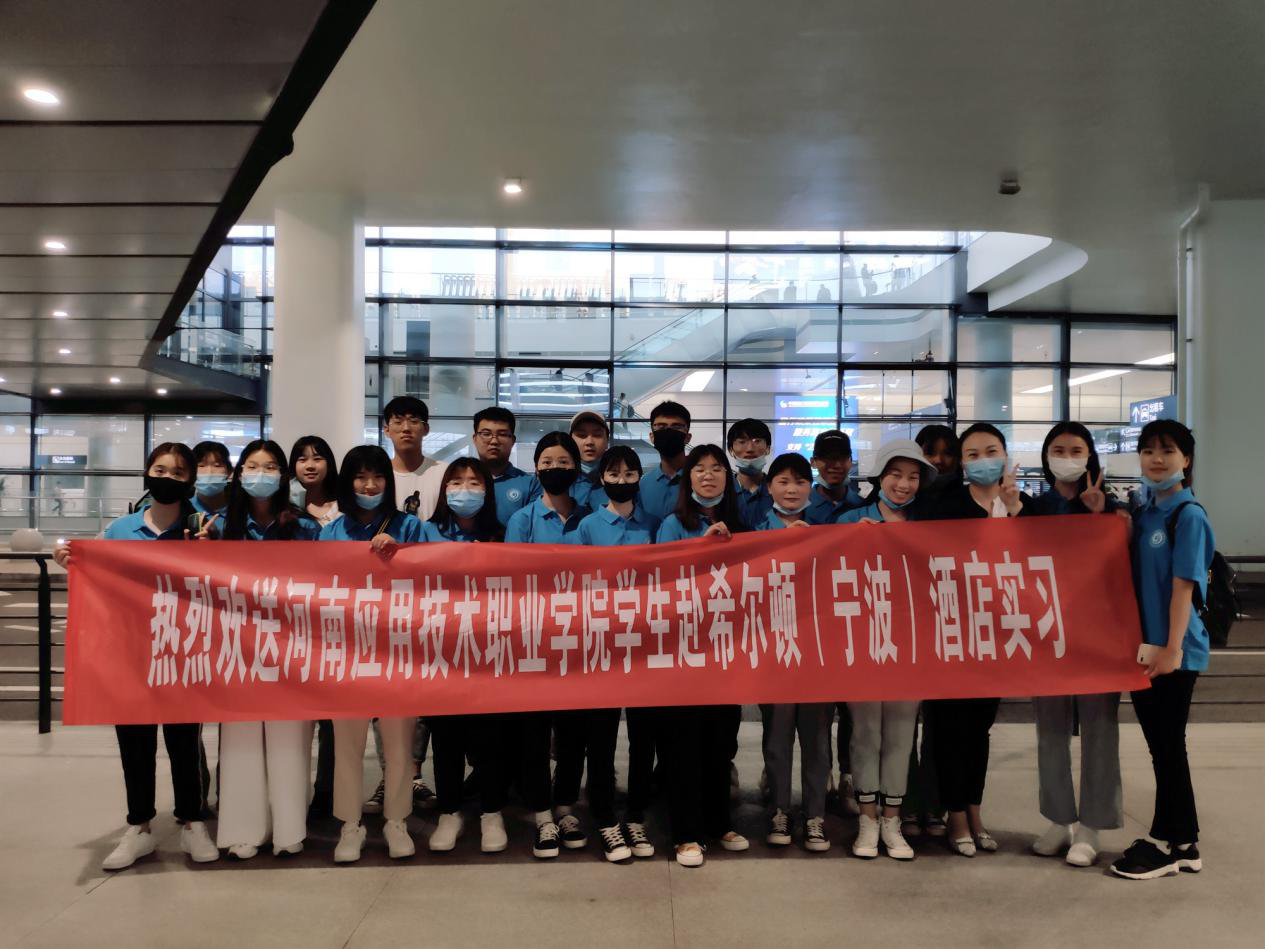 2020年6月5日,河南应用技术职业学304永利集团20名员工及2名带队教师,身着统一工装,在公司实训大楼前开心合影。随后统一乘车前往新郑机场,搭乘由希尔顿集团统一安排的航班前往其宁波酒店顶岗实习。