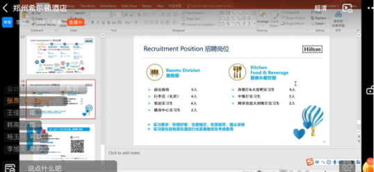 为推进2024届毕业生顺利就业,继续实现“稳就业”目标,2023年3月14日,以钉钉会议形式,公司举办“职为你来”空中宣讲会。学工主任张昂“牵桥搭线”主持会议,郑州希尔顿酒店与同学们“隔空”相聚。