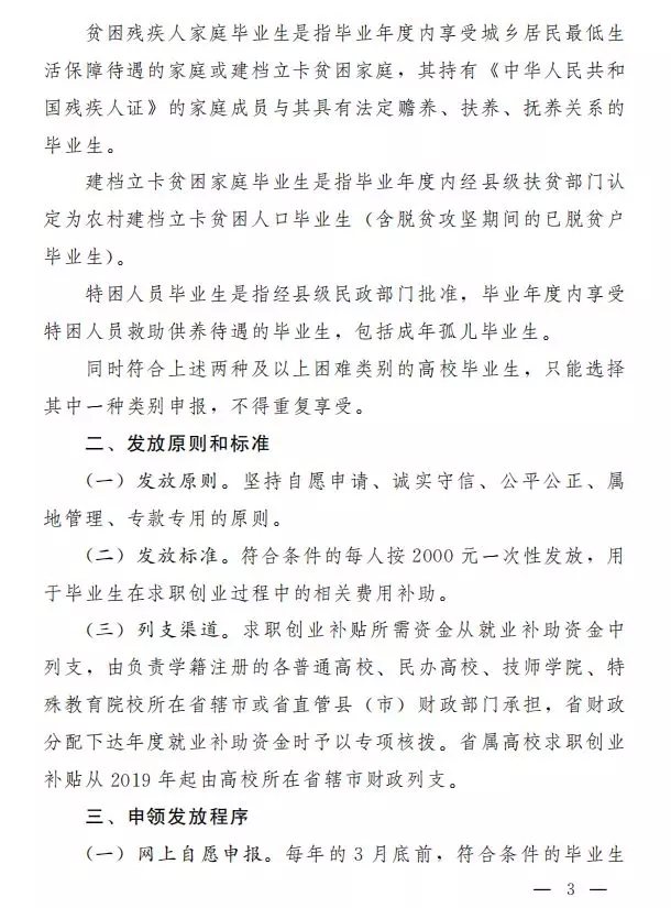 二、发放标准符合条件的每人按2000元一次性发放,用于毕业生在求职创业过程中的相关费用补助。