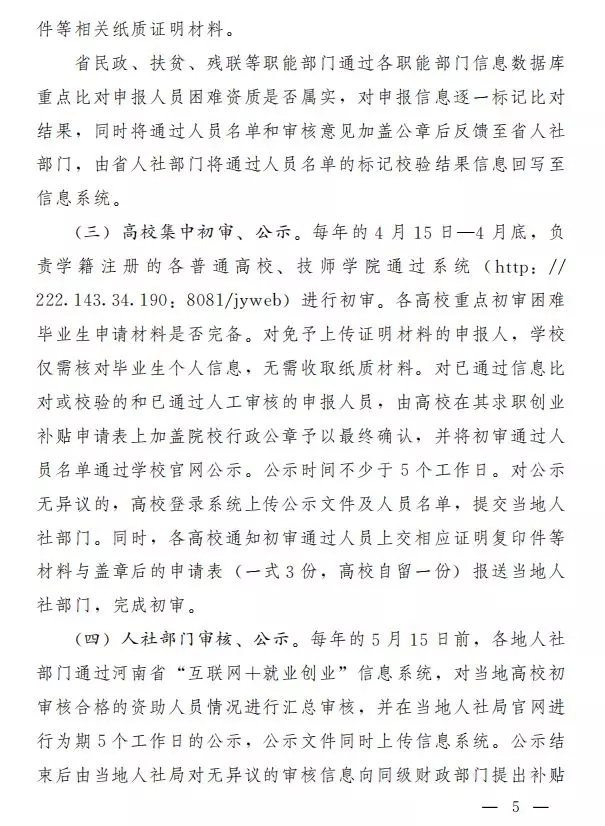 每年的5月15日前,各地人社部门通过河南省“互联网+就业创业”信息系统,对当地高校初审核合格的资助人员情况进行汇总审核。