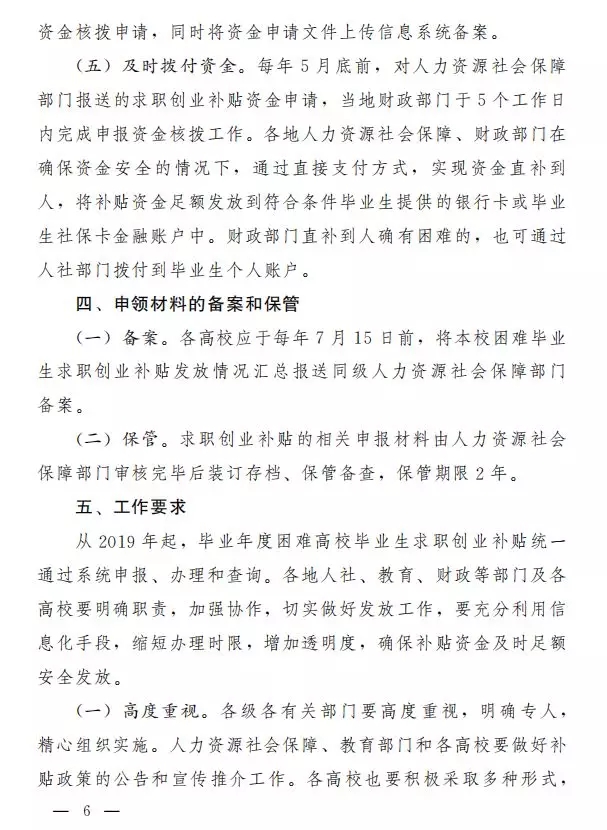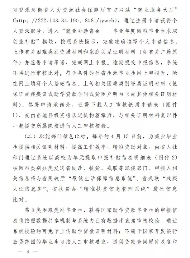 三、申领发放程序每年的3月底前,符合条件的毕业生可登录河南省人力资源和社会保障厅官方网站“就业服务大厅”(http://222.143.34.190:8081/jyweb),通过注册申请获得个人登录账号,进入“就业补助资金——毕业年度困难毕业生求职创业补贴”模块完成网上申报。