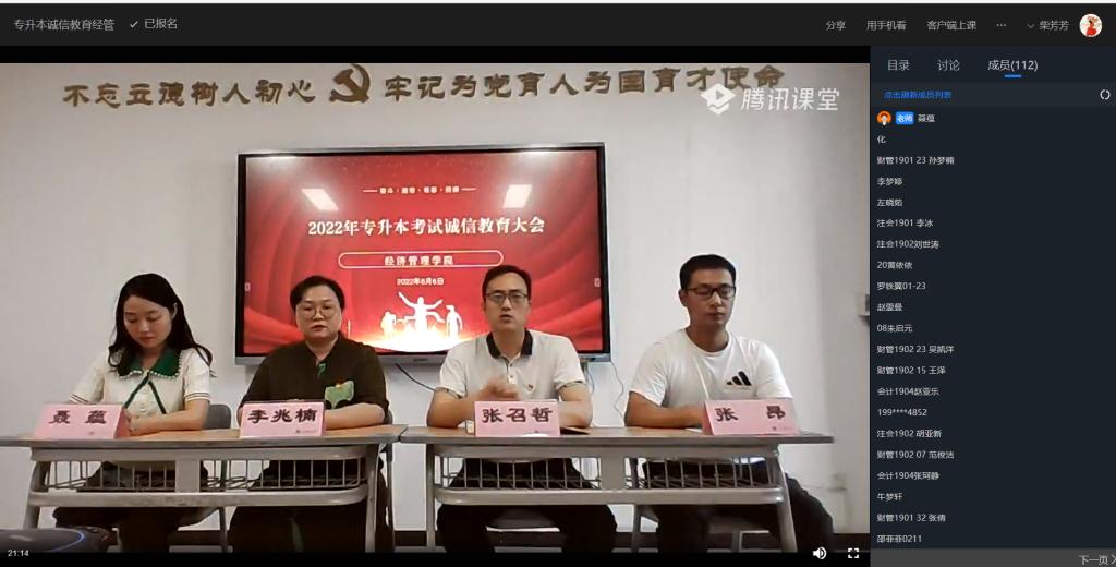 为提高2022年专升本考生诚信意识,培养考生诚信品质,营造诚信、自律、自强校园文化氛围。2022年6月6日下午,通过腾讯课堂,公司召开2022年专升本考试诚信教育大会。会议由团总支书记聂蕴主持,165名专升本考生参加会议,经理张召哲、书记李兆楠、学工办主任张昂出席会议。