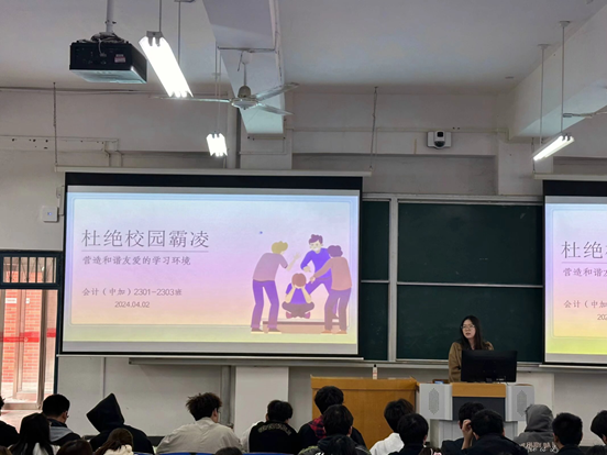 班会上,辅导员以3月10日河北邯郸初中男孩遭同学霸凌事件为案例,给同学们讲解了校园霸凌的概念、表现形式以及应对方法。校园霸凌是指在公司环境中发生的一种持续性、重复性的恶意行为,包括身体、言语、社交或网络上的攻击和侵犯。当面临校园霸凌时,要学会保持冷静、寻求帮助、保护自己等。此外,辅导员指出,校园欺凌是一种违法犯罪行为,有相关法律依据与制裁,希望大家保持敬畏,对校园霸凌坚决说“不”。期间,辅导员还给同学们推荐了反校园霸凌的影视作品,如《保你平安》《少年的你》《第二十条》等。