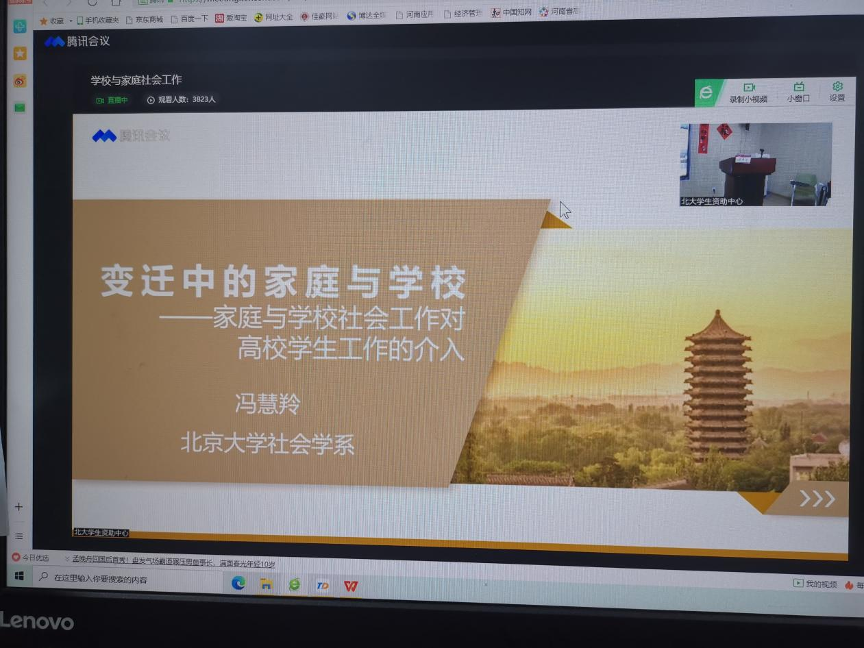 此次线上培训由北京大学社会学系助理教授、美国芝加哥大学社会工作专业博士冯慧羚进行讲解,她以“公司与家庭社会工作”为主题,围绕老员工群体具有的特殊性、社会转型下家庭的变迁及原生态家庭对于老员工群体的影响、公司社会工作介入视角和高校员工工作的伦理问题等四个方面系统讲解了公司社会工作和家庭社会工作,并就传统不良家庭和新时期不良家庭进行详细的对比分析。报告内容详实,剖析深刻,既有理论高度又有实践深度,对公司员工资助工作的进一步开展具有重要意义。员工工作的路途任重而道远,资助育人的知识常看常新,只有坚持学习,才能更好的投身于助人圆梦、育人成才的伟大事业。