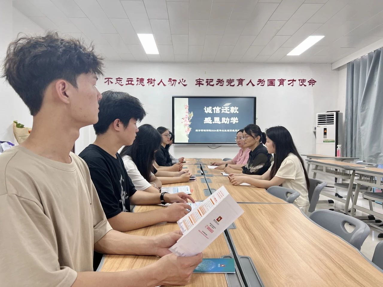 活动前,辅导员为受助员工发放《生源地信用助学贷款还款指南》《高校国家助学贷款还款指南》小册子,一起学习有关助学贷款还款期限、还款利息、偿还方式、提前还款和逾期还款等内容。在座谈会上,王盼红对国家助学贷款和诚信还款的意义进行了说明,希望同学们对偿还助学贷款工作予以高度重视,保证资助工作有序进行和良性发展。期间,她还分享了优秀毕业生受助事迹,希望同学们心怀感恩、诚信做人、诚信谋事,在新的人生征程中砥砺前行、再创佳绩。最后,王盼红一一为提前还贷款员工发放公司学工部定制的纪念礼品,祝贺大家毕业快乐、前程似锦!