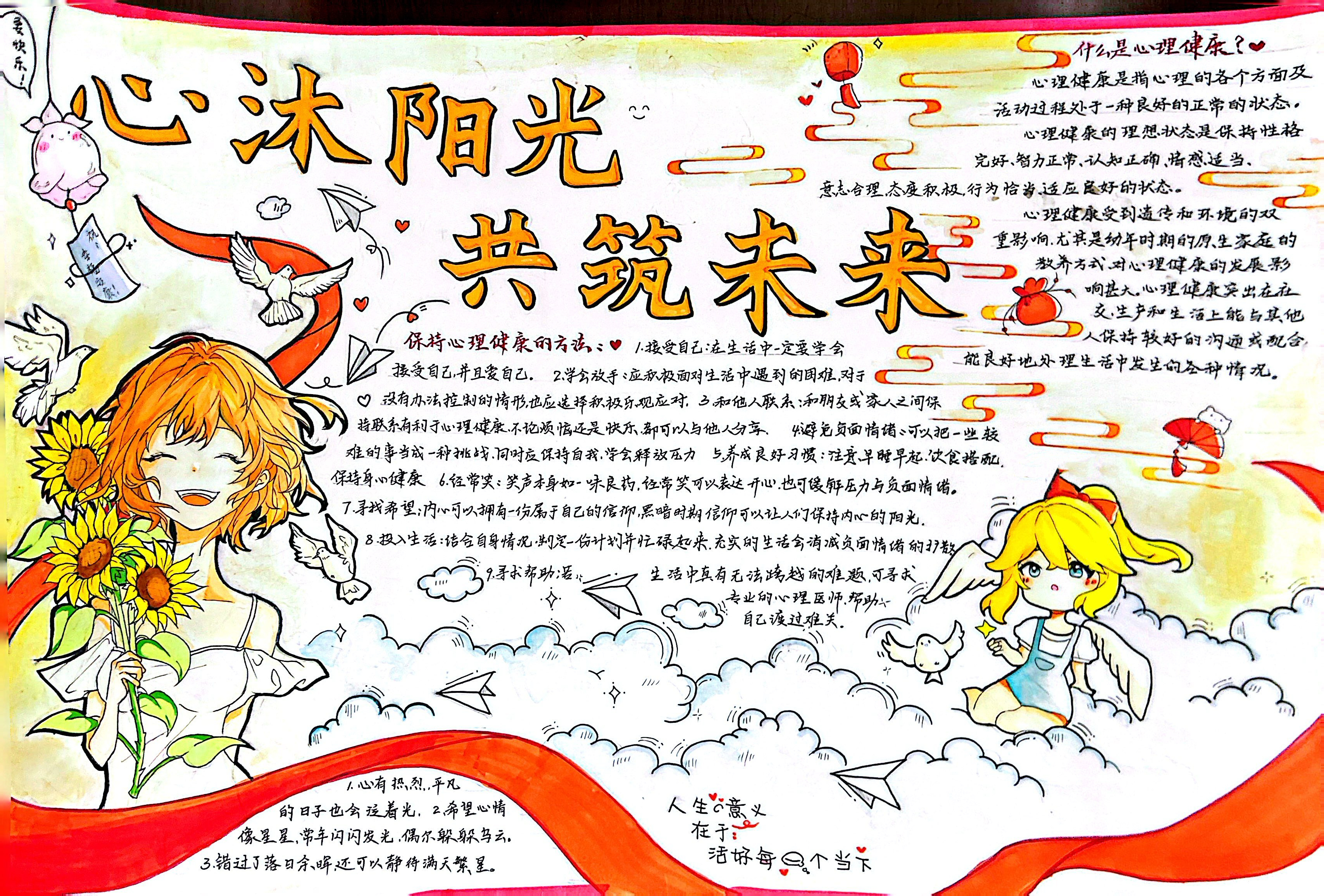 为进一步普及心理健康教育知识,切实提高公司员工的心理健康水平,公司开展了“心随画映”心理健康主题手抄报活动,同学们发挥自己的创意和想象力,用手中的笔和纸描绘出自己对健康心理的理解,传递了有关心理健康的知识,表达出积极向上的人生态度。
