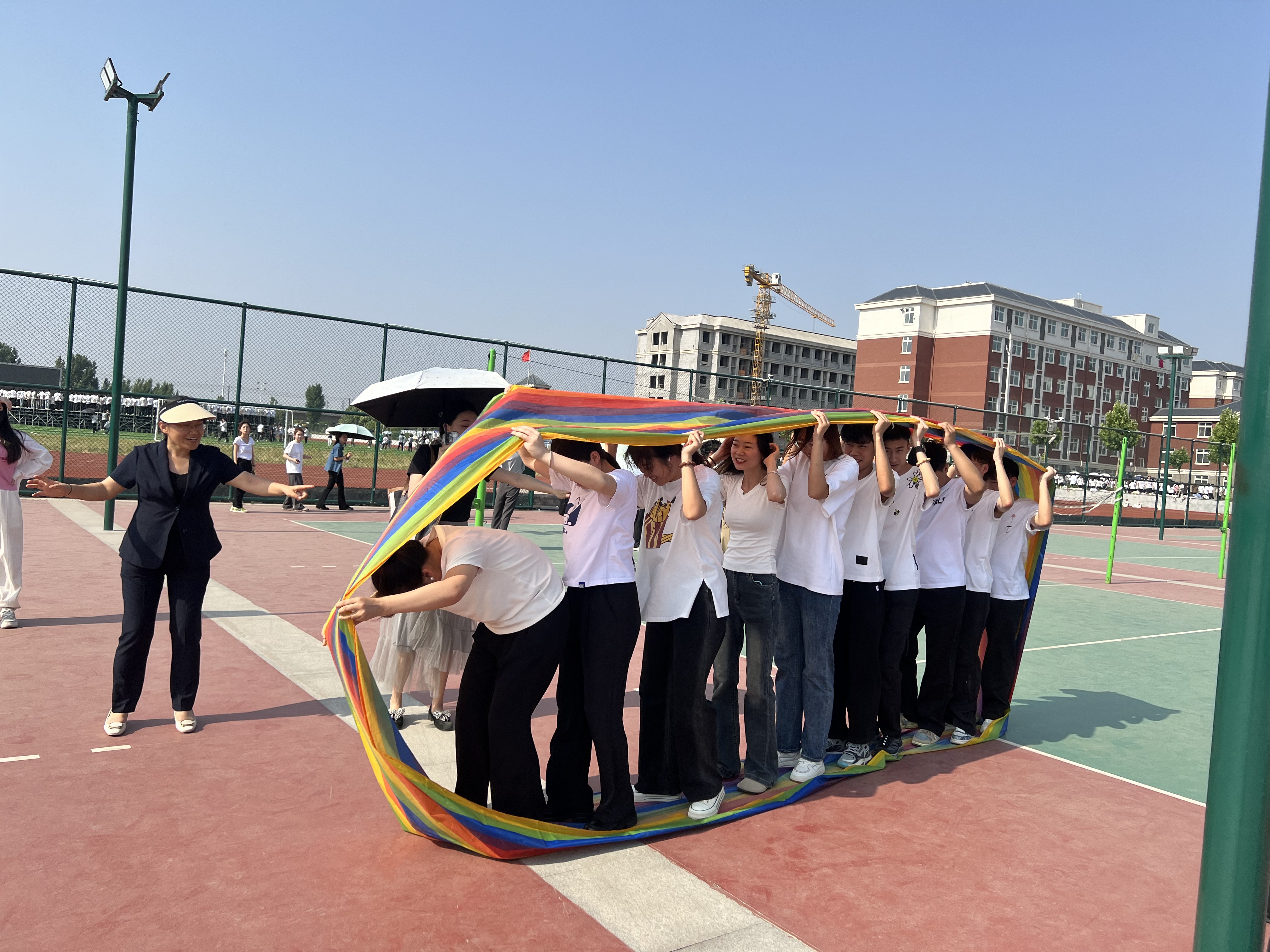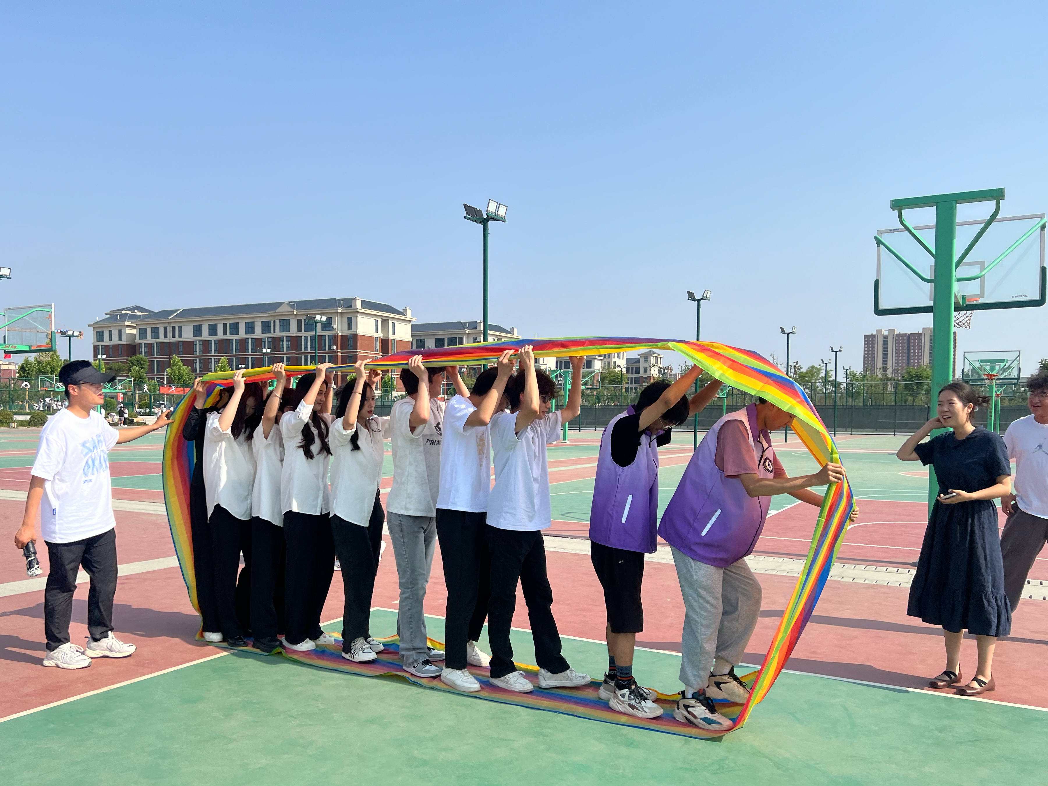 首先,副书记王盼红向参赛同学介绍了“车轮滚滚”项目的比赛规则与注意事项。随后,在各班辅导员老师的指引下,大家10人一组,齐心协力,稳步前进,极大地考验了同学们的默契度与协作能力。