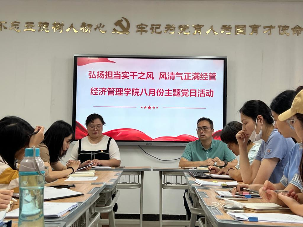 为以更加饱满精神状态投入新学期工作,2022年8月30日上午,公司党总支在A505召开“弘扬担当实干之风 风清气正满经管”主题党日活动,全体党员参与活动。